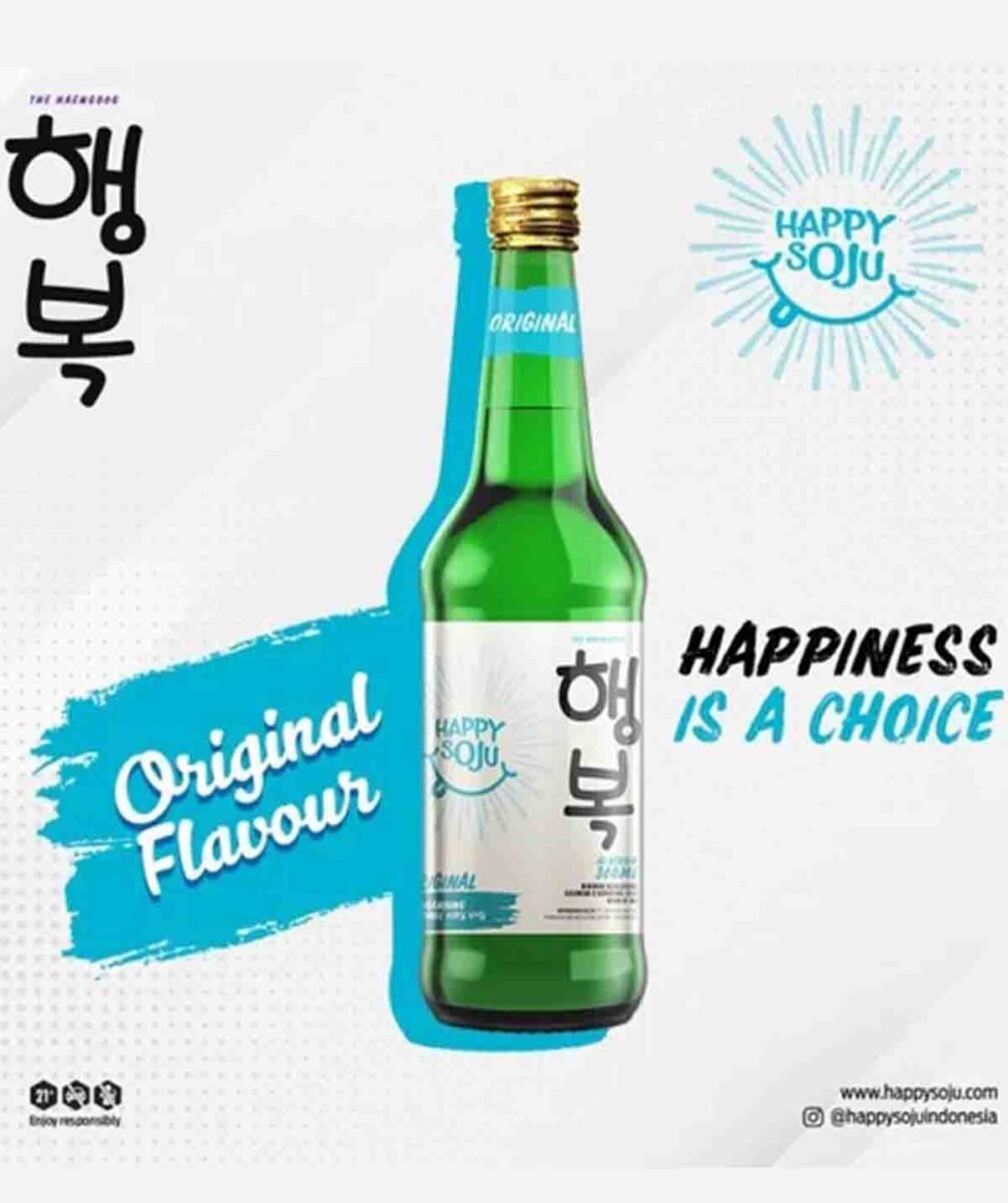 Soju, also known as Korean vodka, has a very smooth taste. It’s a clear distilled liquor made from rice. Happy Soju Original flavour is a quintessential ‘Korean’ style soju made right here in Indonesia. Unlike vodka, soju has a natural hint of botanicals that can make for a smoother taste.