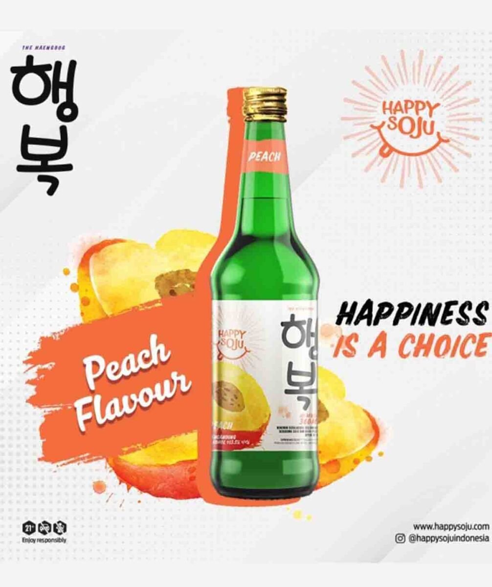 Happy Soju Peach flavour is made right here in Indonesia and offers aromas of fresh ripe peaches that take you away to your happy place. Crisp, clean and fruity, Happy Soju Peach is great on its own or with grilled dishes and a bit of spice. Best Served chilled. Even better served with friends!